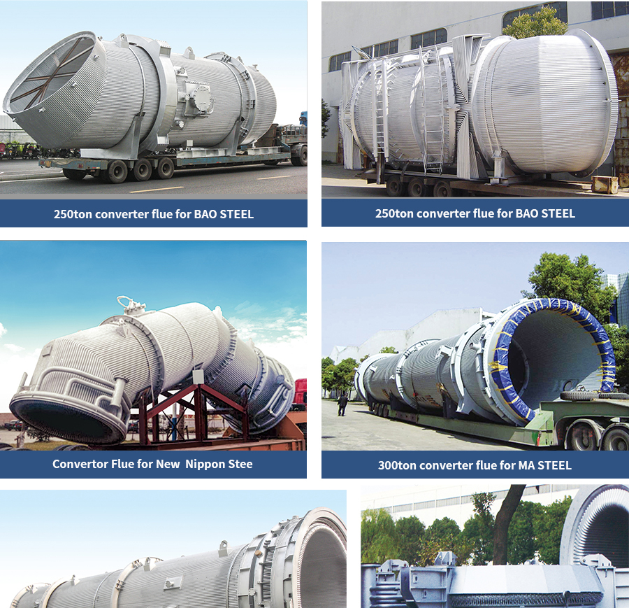Converter flues within the range of 15ton to 300ton have been designed and manufactured since 1990. The pressures of flues are 0.8Mpa~4.0Mpa.The circulation is nature type for 80ton and below converter flues, nature + force circulation for converter flues above 80ton. Meet the needs of the domestic market (with a domestic market share of more than 80%)Meanwhile, products are exported to Korea, USA, etc.,